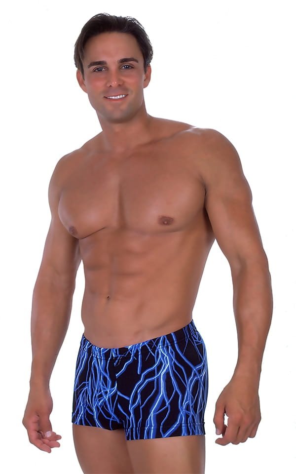 • A men's boxer swimsuit with 4 front panels for a package form fit • The front panels can be special ordered with alternate fabrics to provide contrast